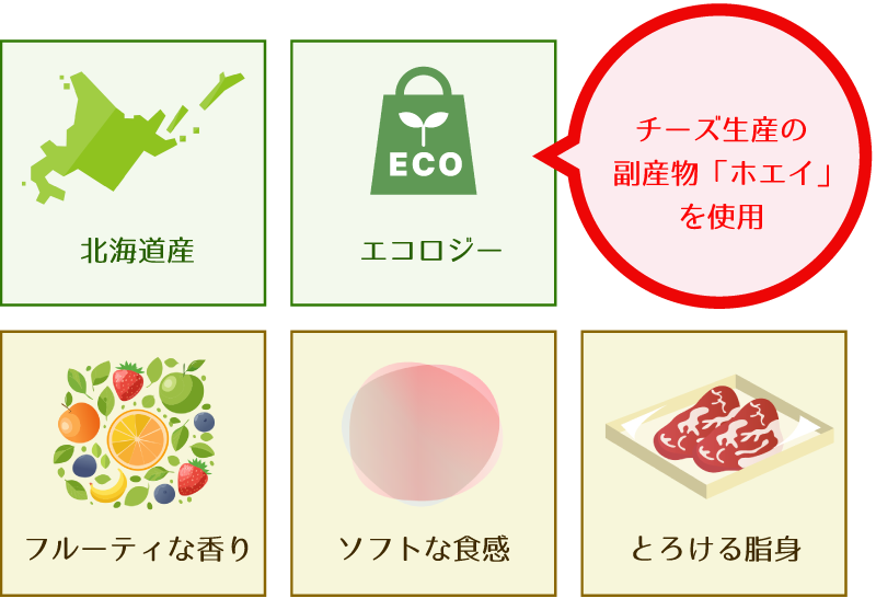 酪農王国北海道。北海道ホエイ豚は、道内のチーズ生産過程で発生するホエイ(乳清)を給餌した豚です。豚にホエイを一定量以上給餌すると整腸効果等があり健康に育ちます。